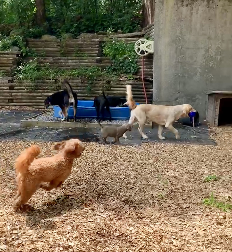 A typical puppy coming to The Bark & Call Inn has made friends with all the routine daycare dogs by the time the puppy is 5-9 months old and ready to join the larger playgroup. The transition into the larger playgroup is smooth and seamless because the puppy has already formed individual relationships with each of the dogs.