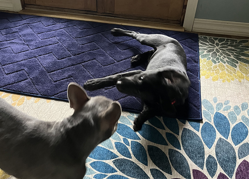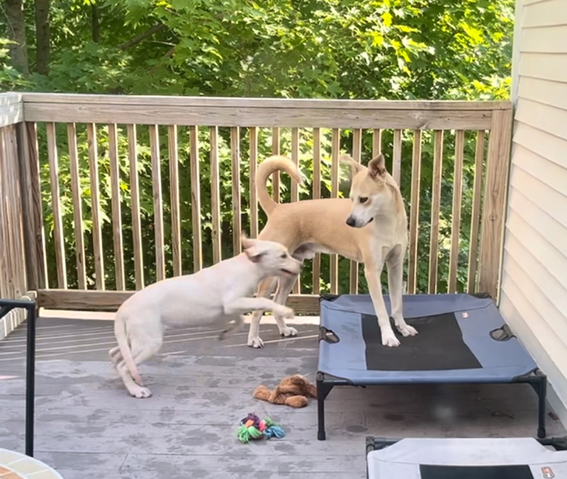 Once the puppy is fully acclimated, comfortable, and curious, a single dog is brought into The Calvin & Hobbes Suite for the puppy to meet and play with. The companion dog is chosen based on compatibility across a wide array of factors, for example, size, sociability, play style and energy level. Once a friendship is established with that dog, that dog rejoins the larger playgroup and another dog is brought in for the puppy to meet and socialize with. The same factors for choosing a compatible dog apply. This continues over the course of days/weeks/months within the puppy’s own timeframe and comfort level. As the puppy ages, longer periods of time are given for play with each dog, allowing an age appropriate, graduated method of introduction to social play.