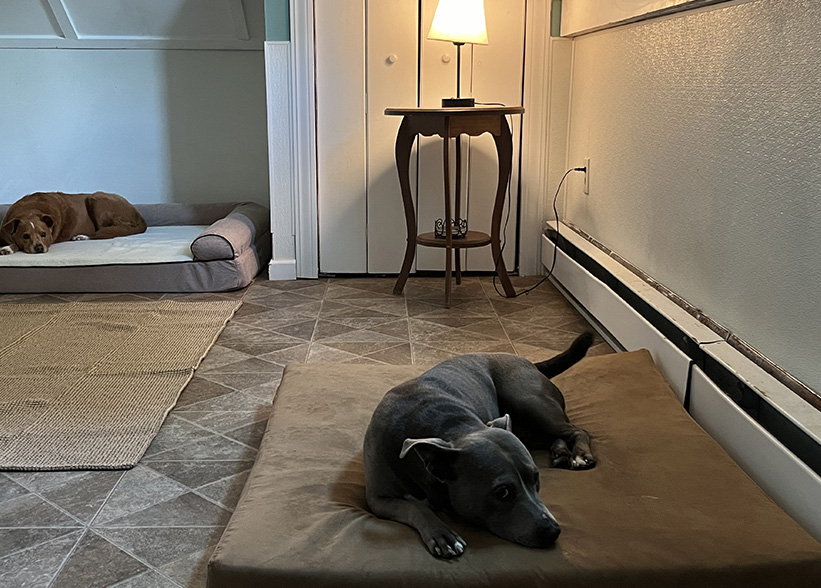 Crates are available upon request for dogs who prefer that. Safety is paramount. For this reason, any dog who becomes destructive, will not let other dogs settle for sleep or engages in any disruptive behavior will be crated. Puppies who are still in chewing stages and cannot be safely left loose will be crated overnight within the Calvin & Hobbes Suite.